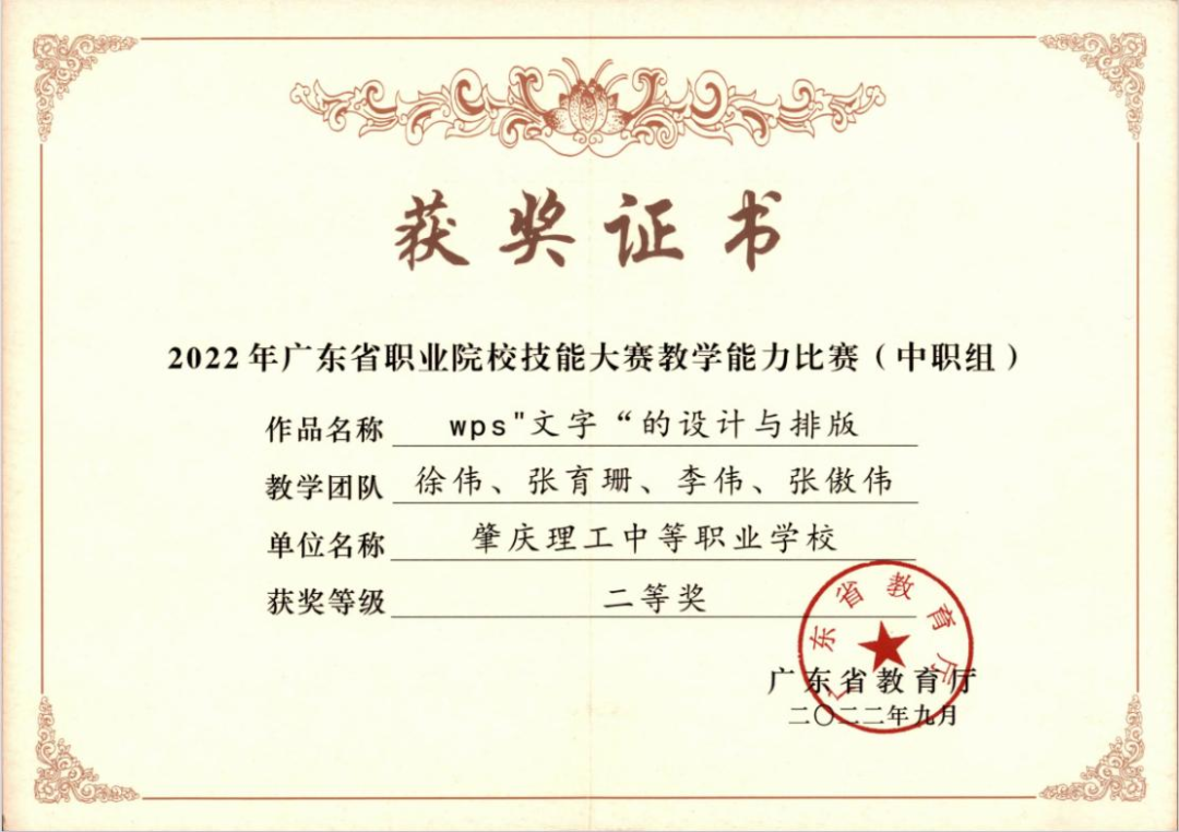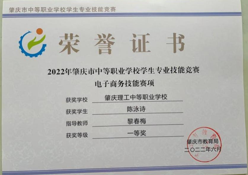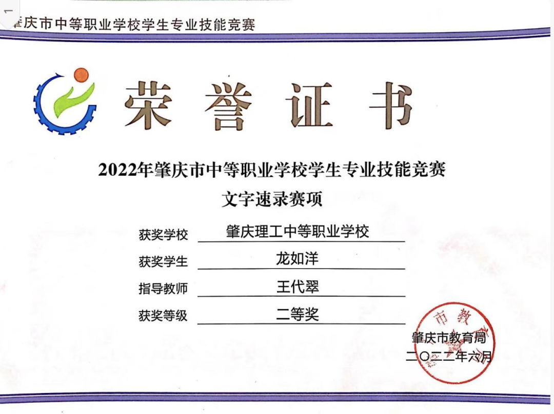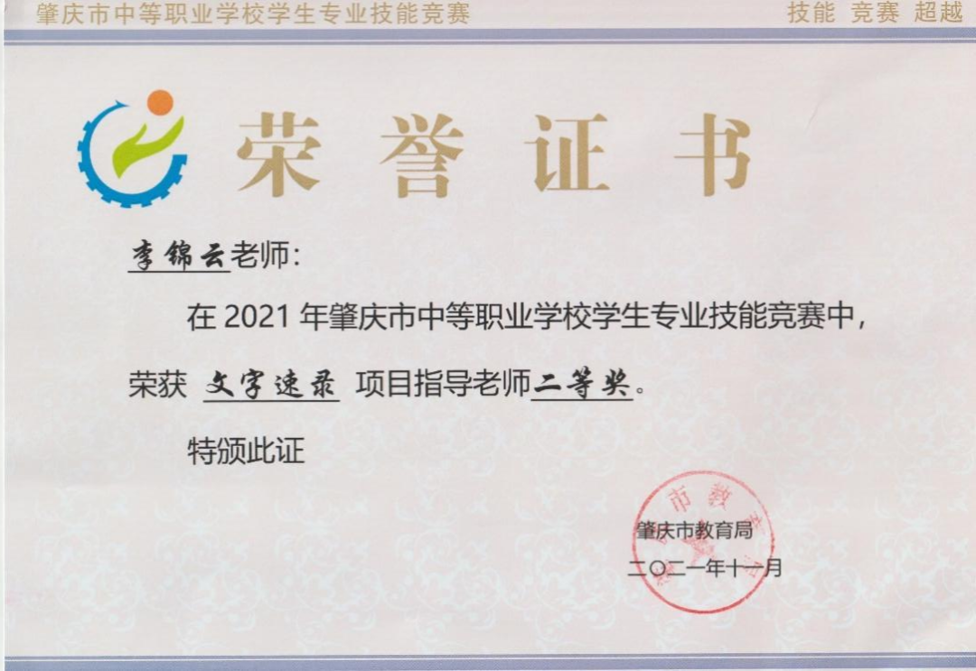 (1)2022年获肇庆市学生技能竞赛《汉字录入》赛项指导老师二等奖。