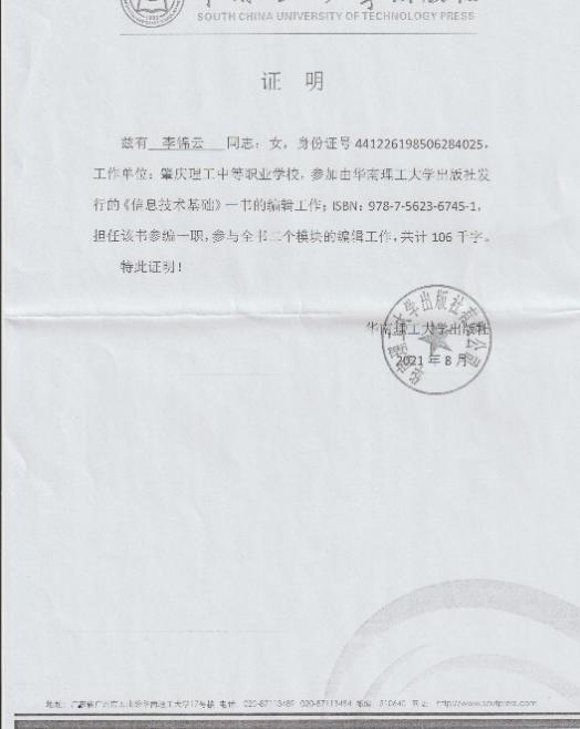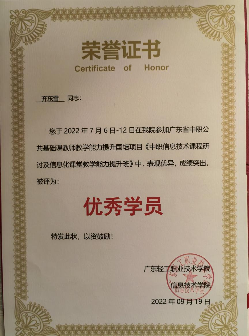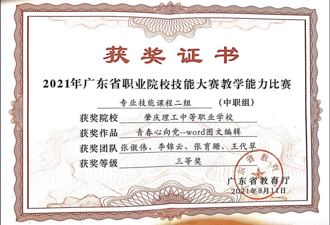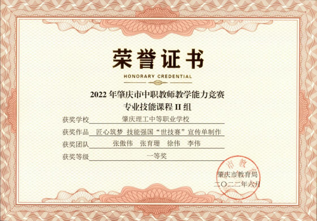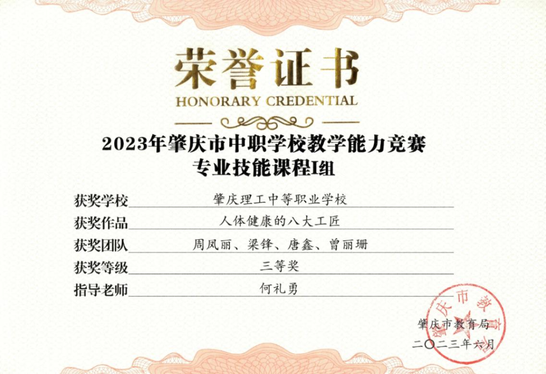 (1)2022年获肇庆市学生技能竞赛《汉字录入》赛项指导老师二等奖。