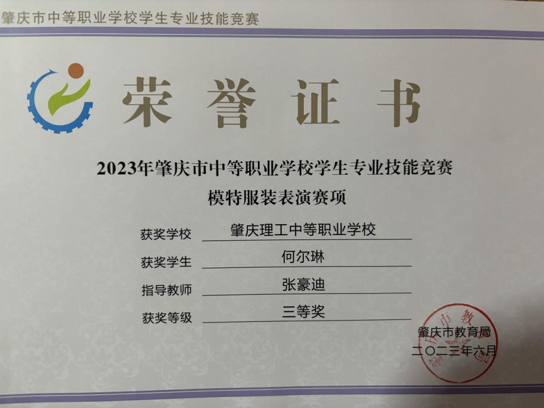 2023年获肇庆市中等职业学校学生专业技能竞赛《模特服装表演》赛项指导老师三等奖