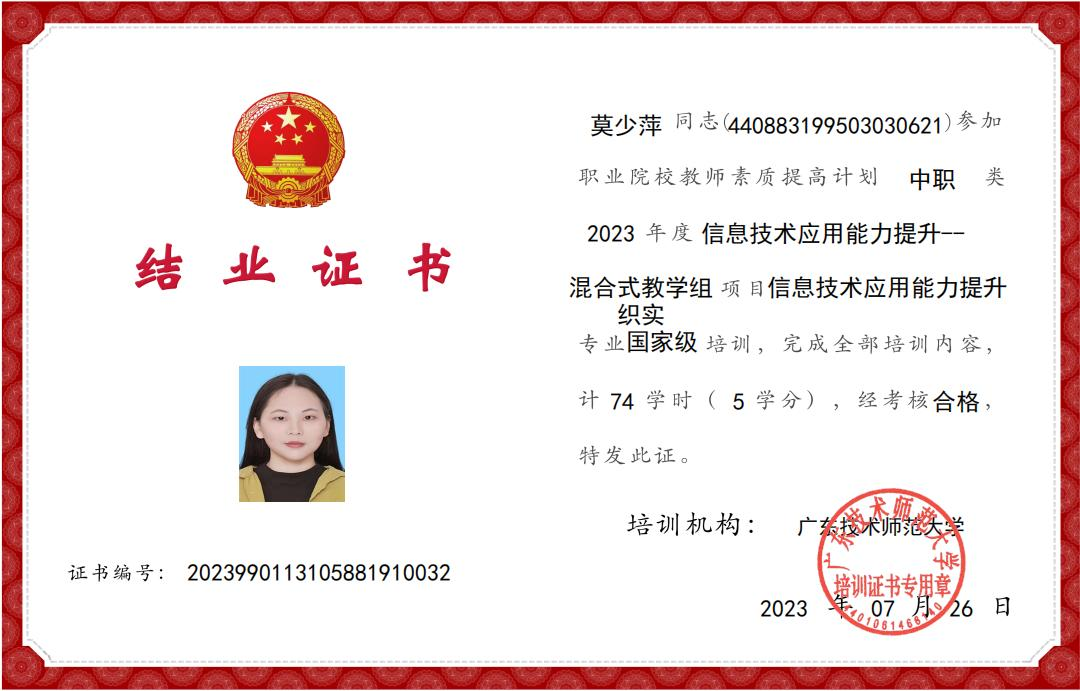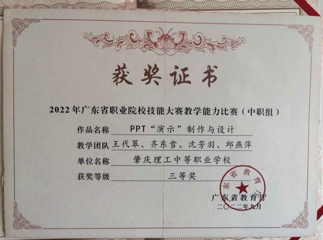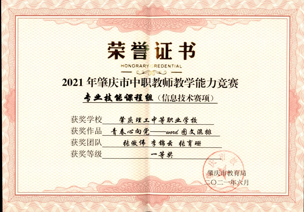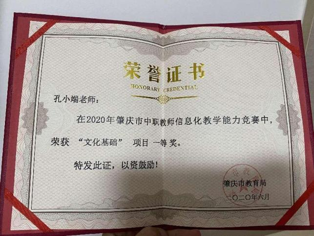 (1)2020年6月,肇庆市中职教师信息化教学能力竞赛,获“文化基础”项目一等奖