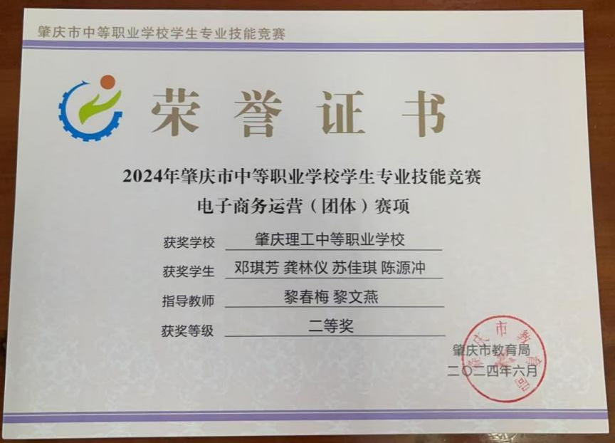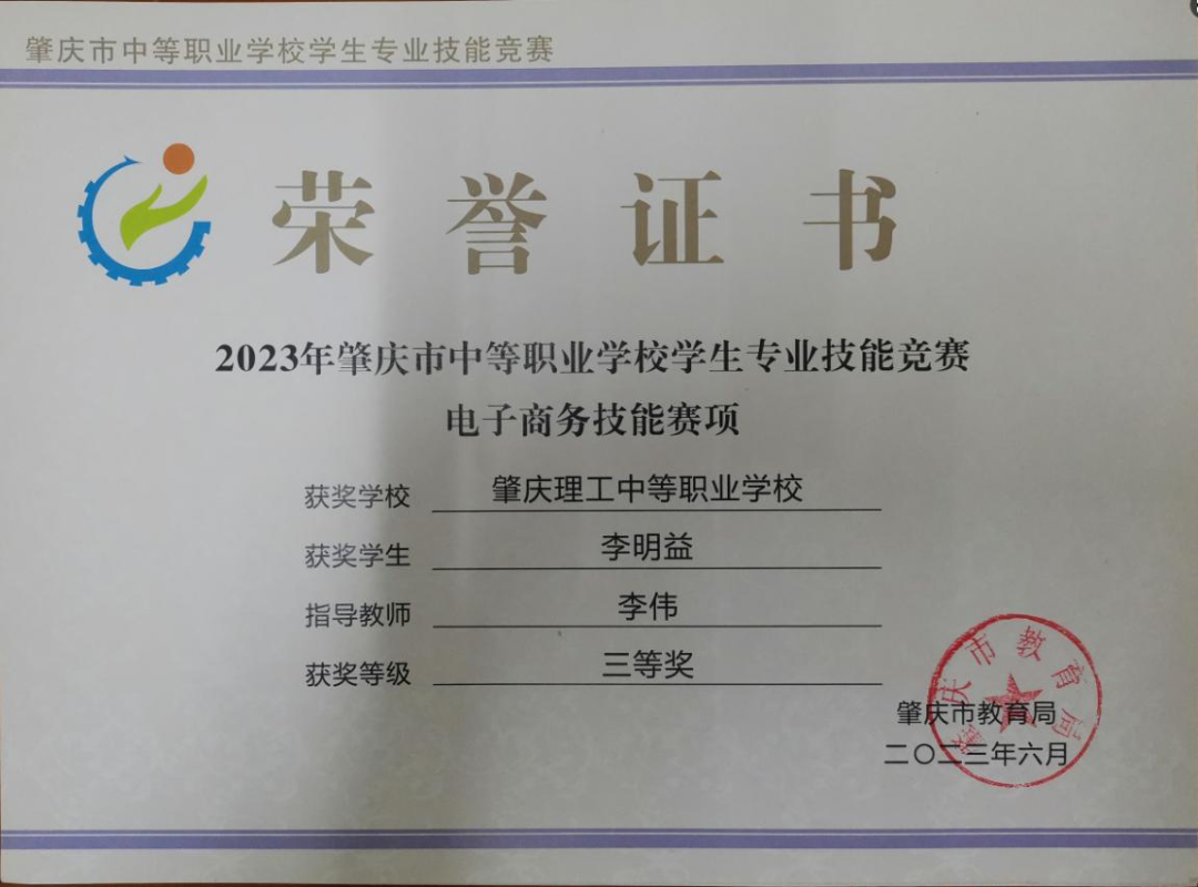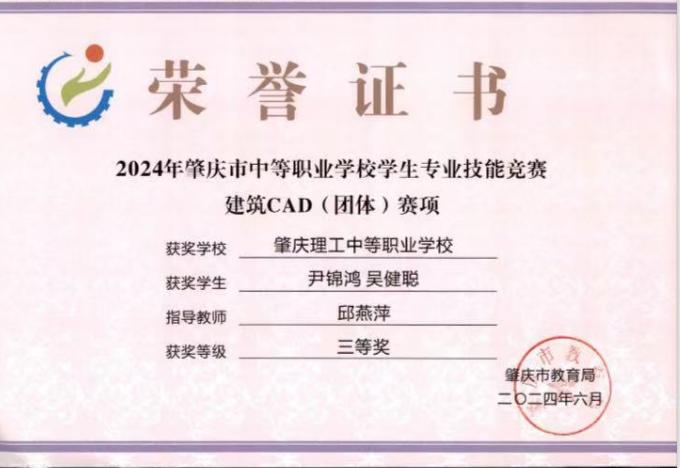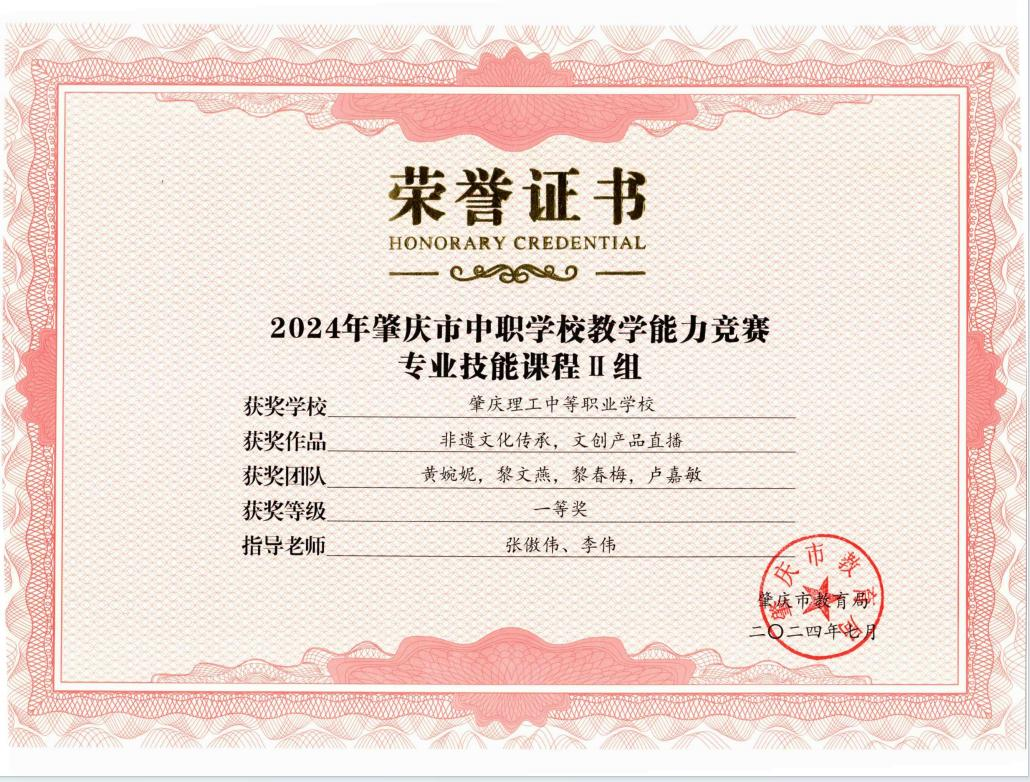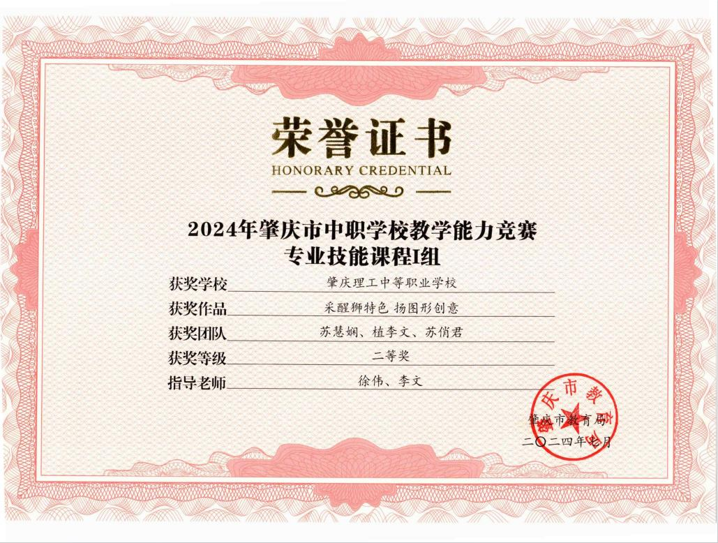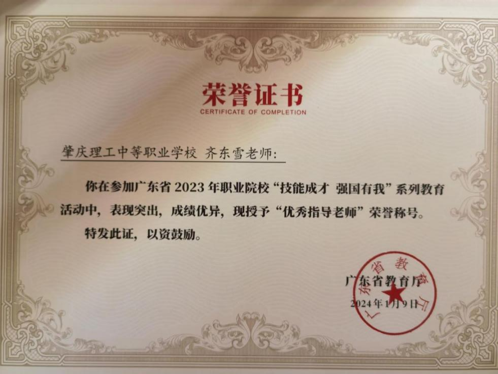 (1)2024年肇庆市中等职业学校学生专业技能竞赛指导老师一等奖。