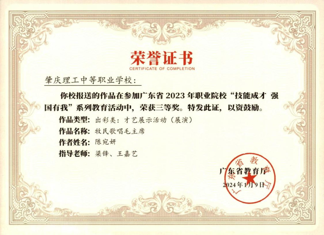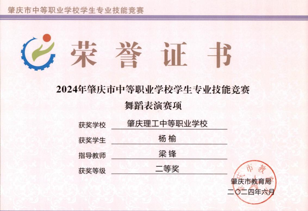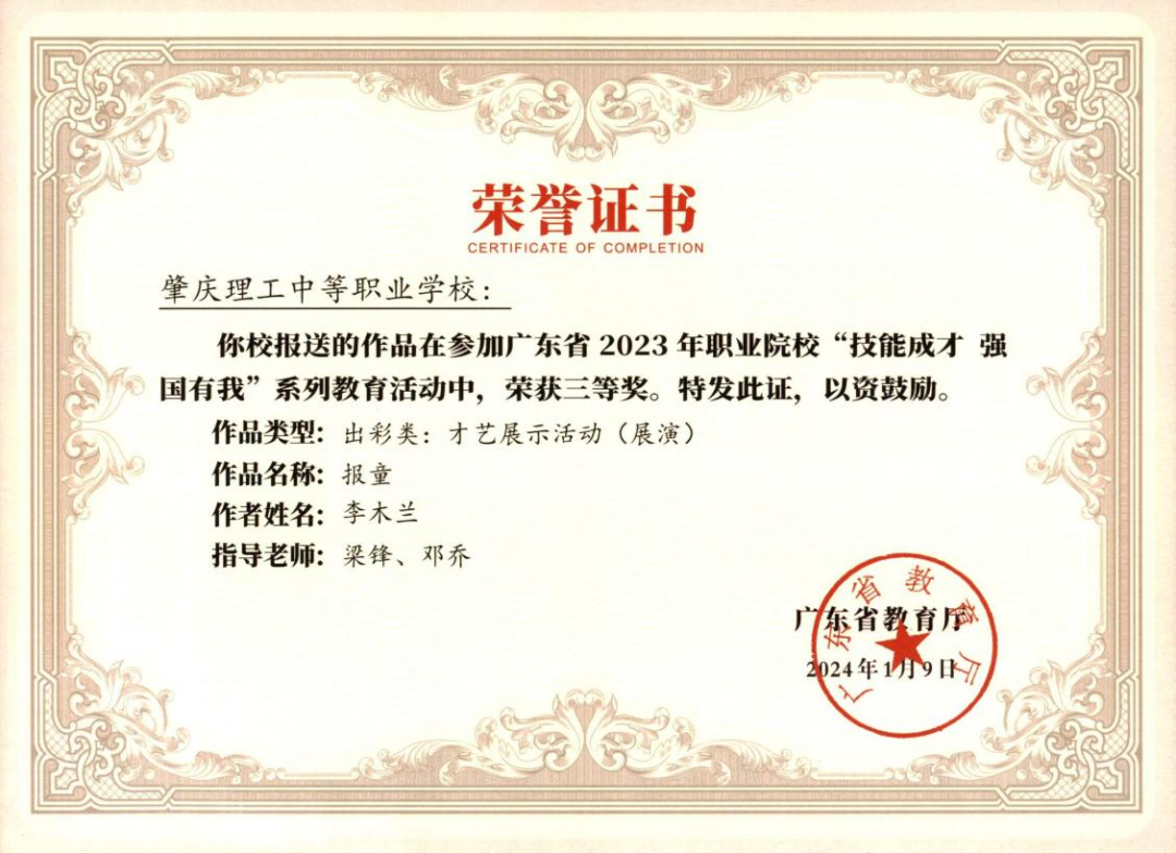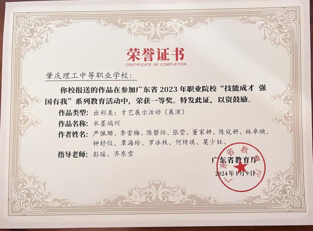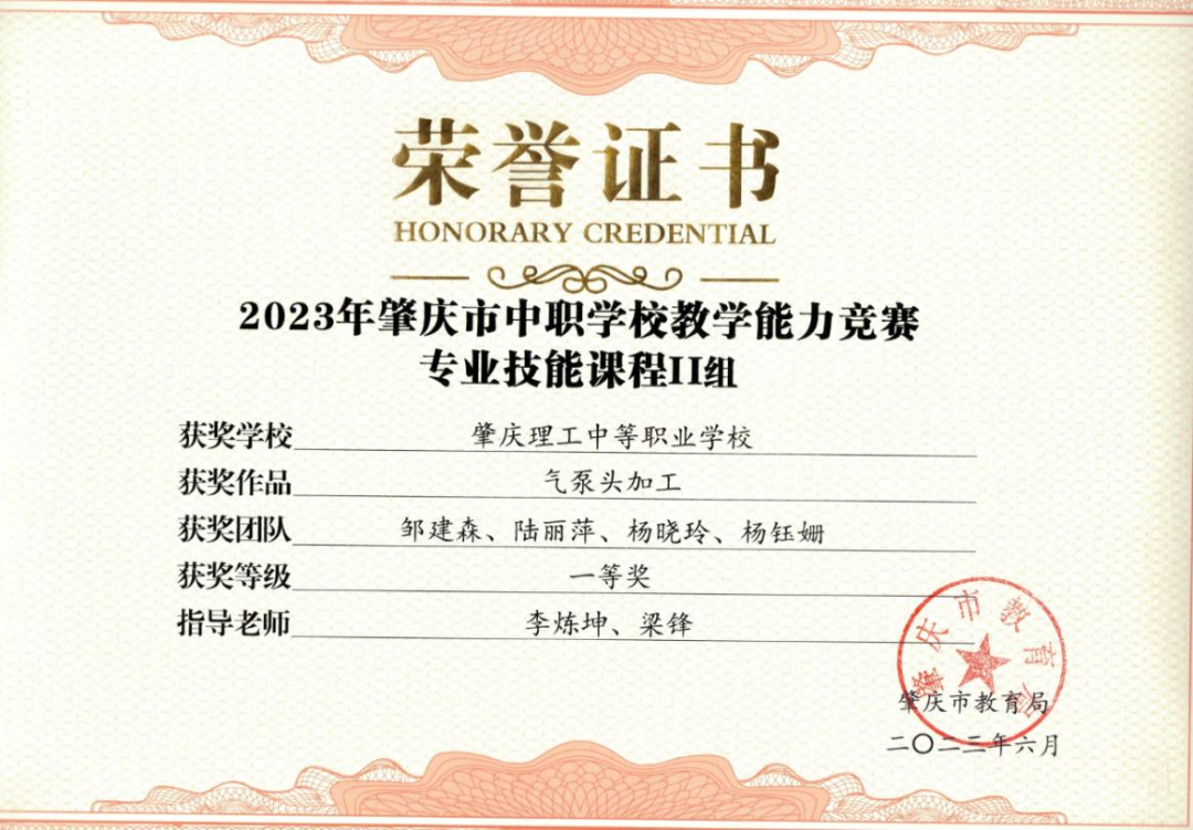 (1)2024年肇庆市中等职业学校学生专业技能竞赛指导老师一等奖。