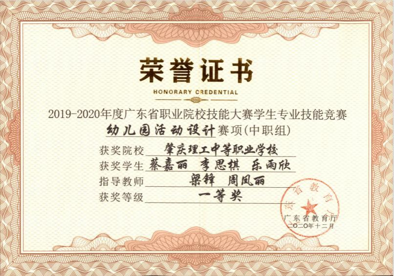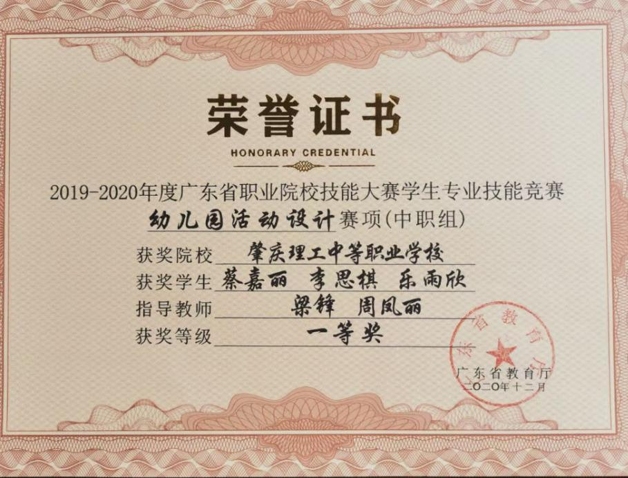 2.2020年指导学生参加广东省职业院校技能大赛学生专业技能竞赛幼儿园活动设计赛项(中职组)一等奖