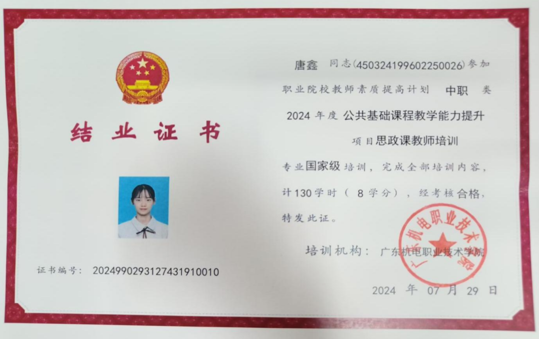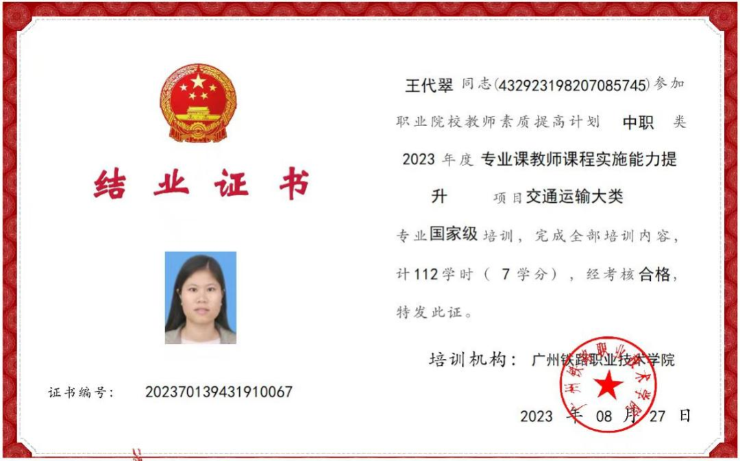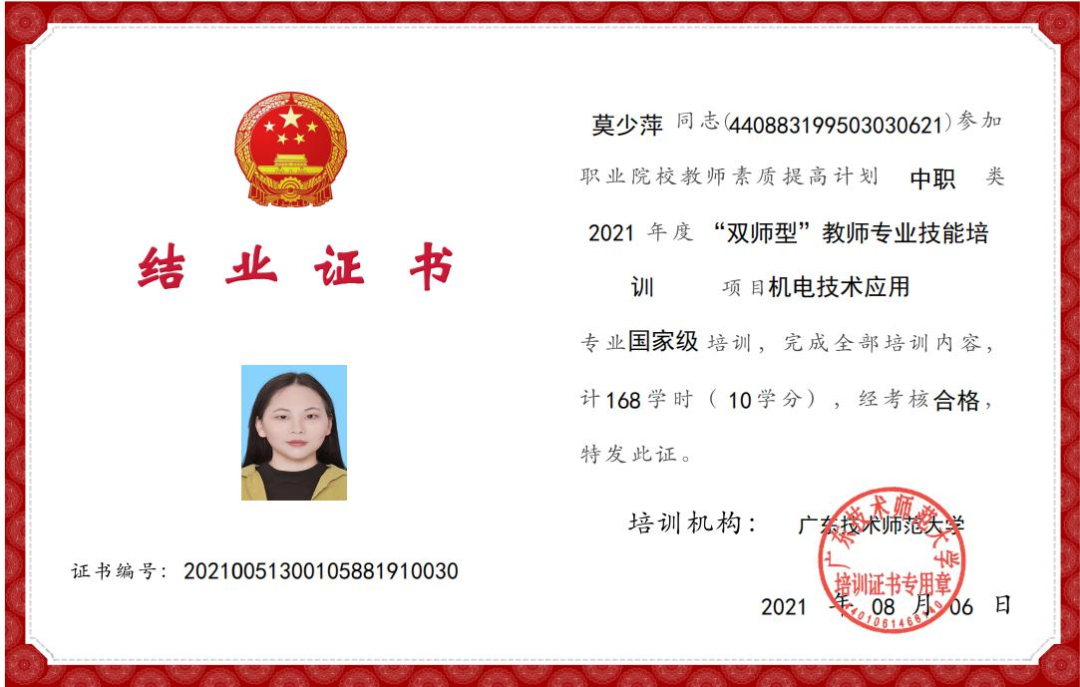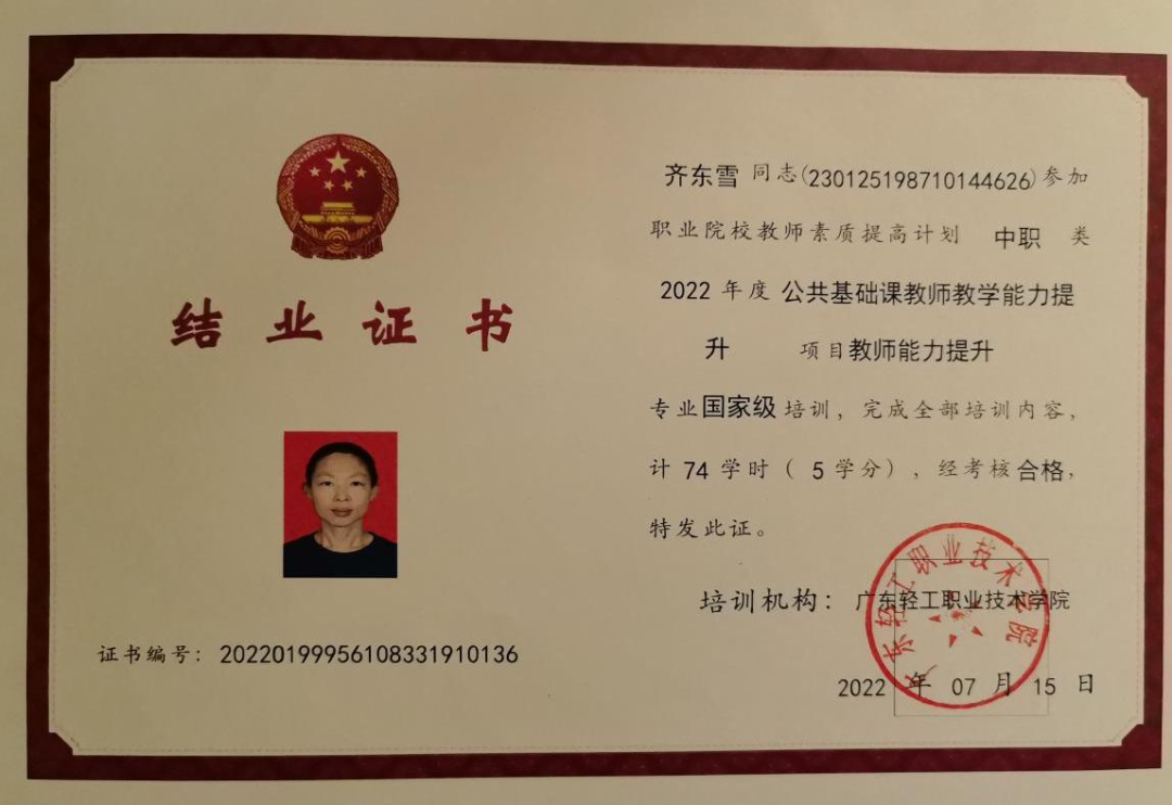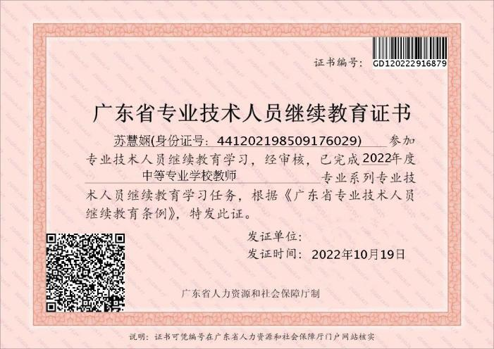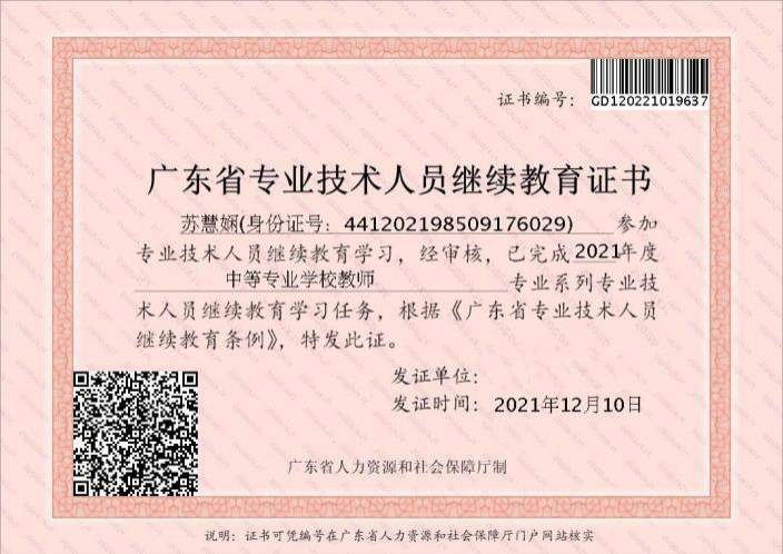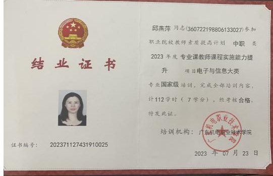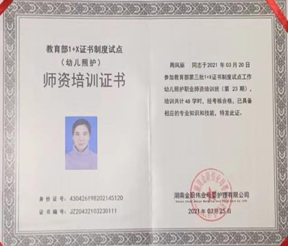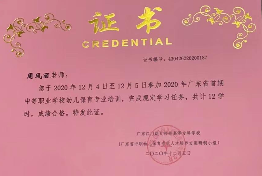 作为一名专业教师,积极参加各类培训如:《2020年广东省首期中等职业学校幼儿保育专业培训》《2021年教育部1+X证书制度试点(幼儿照护)师资培训》《2022年肇庆教学能力提升国培班》、主持省级教改项目《幼儿卫生保健》精品课程建设,先后考取了公共营养师、心理咨询师、家庭教育指导师等资格证书,以多种形式加强理论学习,提升业务能力。