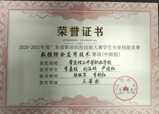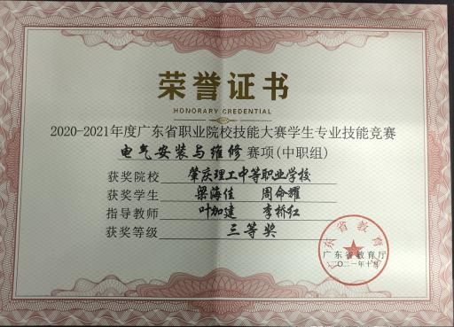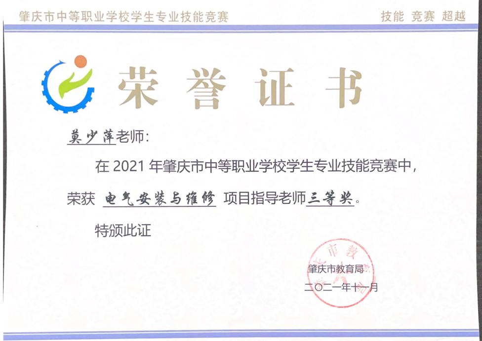(1)2021年获肇庆市学生技能竞赛《电气安装与维修》赛项指导老师三等奖
