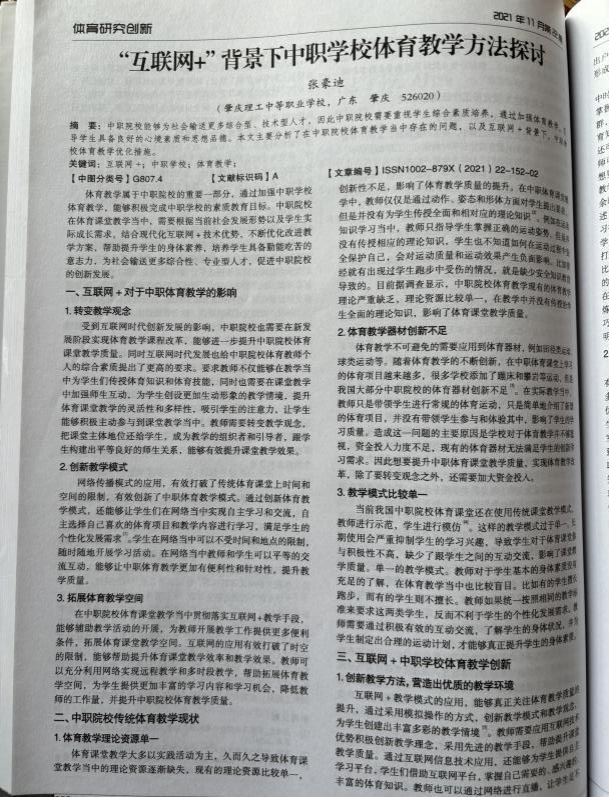 1.2021年11月在《体育画报》发表论文《“互联网+”背景下中职学校体育教学方法探讨》