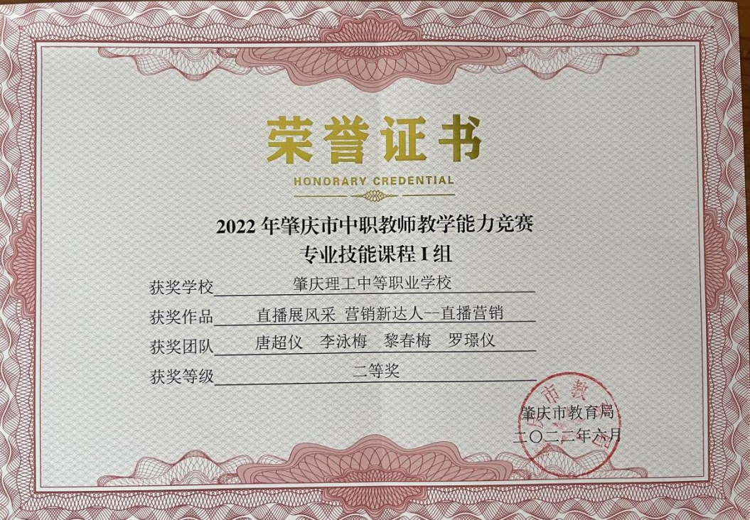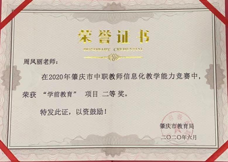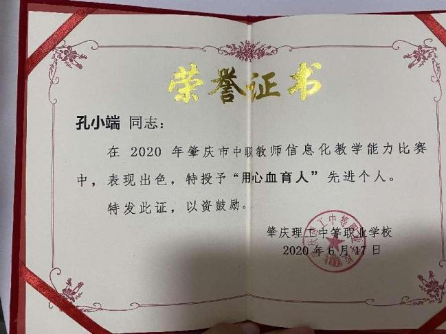 1.2020年获得肇庆市中职教师信息化教学能力竞赛二等奖