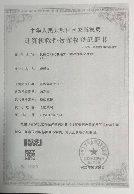 申报了《机械自动化制造加工数控信息化系统》计算机软件著作权,实用新型专利两项“一种机械自动化加工防护装置”和“一种机械自动化运输装置”,在校内编写教材材料两本,分别是《数控机床实训指导书》和《工业机器人应用实训指导书》。