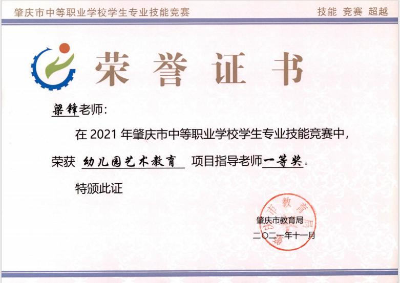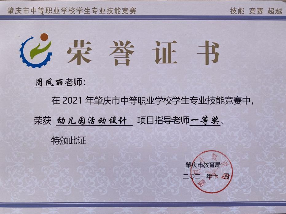6.2021年指导学生参加肇庆市中等职业学校学生专业幼儿园活动设计赛项获得一等奖。