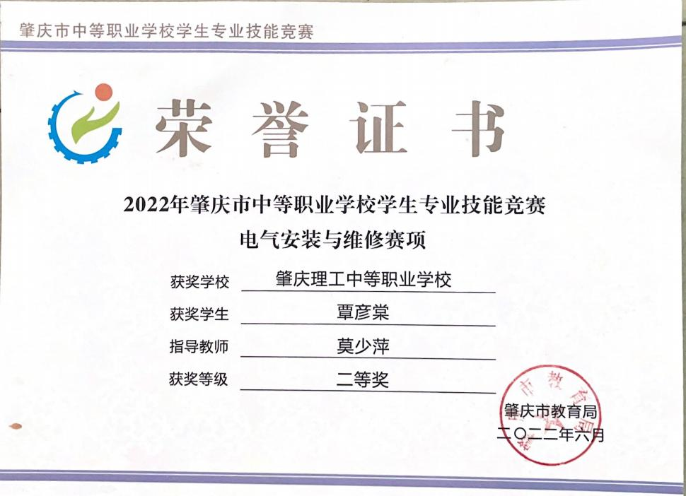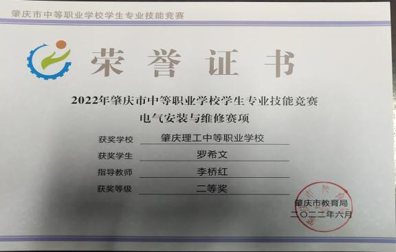 (2)2022年获肇庆市学生技能竞赛《电气安装与维修》赛项指导老师二等奖