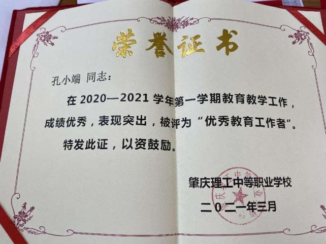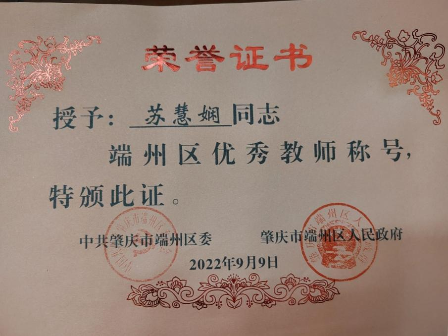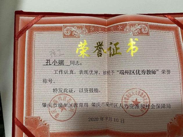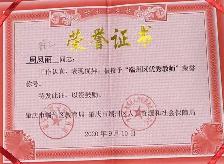 2020年获得“端州区优秀教师”荣誉称号