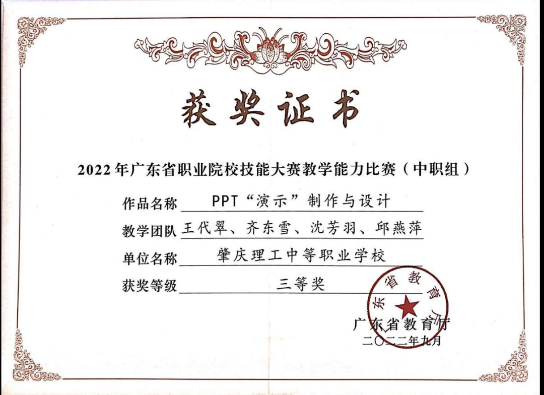 (3)2020年9月,广东省职业院校技能大赛教学能力比赛中职教育组,获三等奖