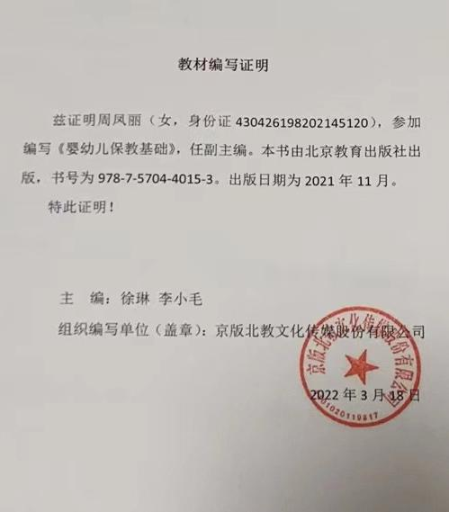 2022年编写教材《婴幼儿保教基础》任副主编。