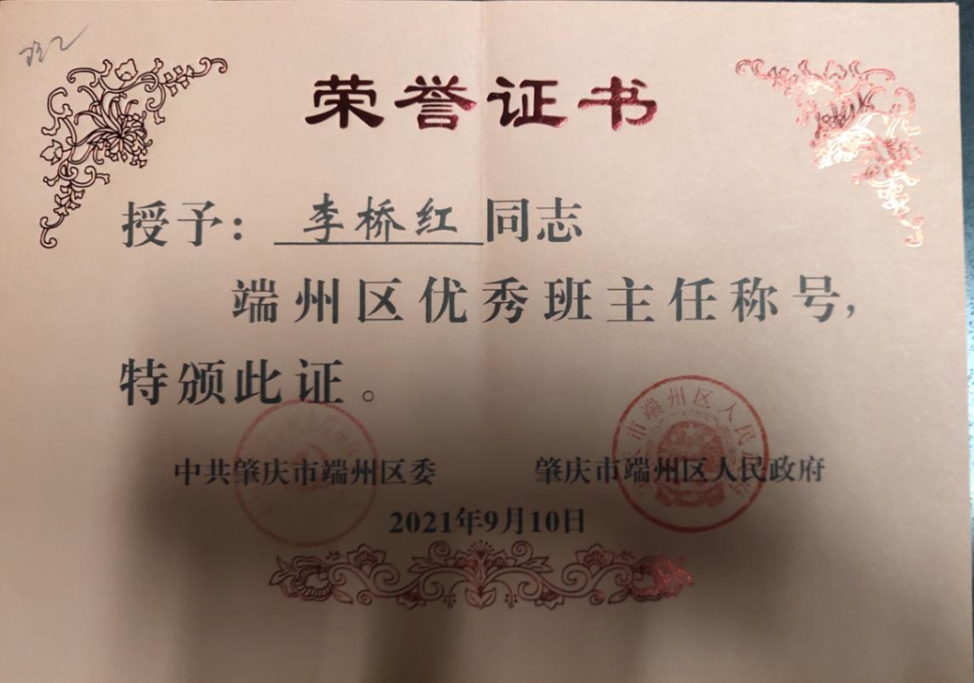 1.2021年获得“端州区优秀班主任”荣誉称号